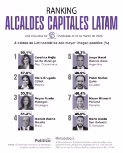 La ejecutiva municipal de la capital dominicana encabezó con la mayor imagen positiva a los alcaldes capitalinos de América Latina, un ranking publicado este 30 de marzo por la firma CB Global Data. Carolina encabeza el ranking con un 60.1 por ciento, superando a Clara Brugada de Ciudad de México (57.6 %), Reyna Rueda de Managua (53.5 %), Ibaneis Roche de Brasilia (51.2 %) y Jorge Macri de Buenos Aires (48.3 %).