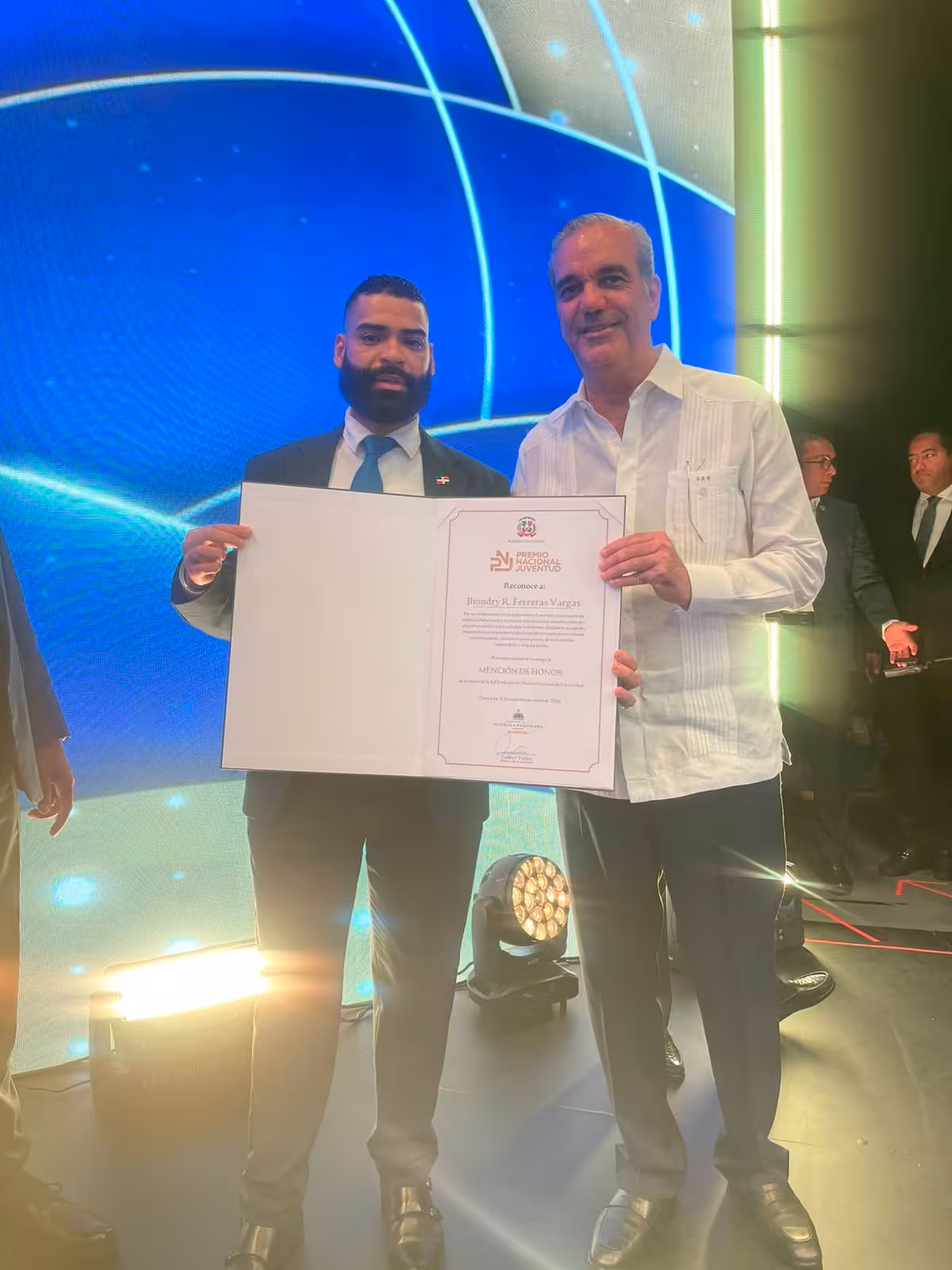 Durante la ceremonia fueron reconocidos jóvenes en 15 renglones distintos, destacándose la Mención de Honor otorgada a Jhondry Ferreras por su ejemplo de resiliencia, su vocación de servicio y su compromiso permanente con la juventud dominicana, demostrando que el verdadero liderazgo nace del esfuerzo y la coherencia.