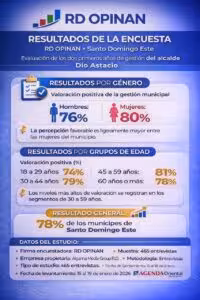 El estudio forma parte de los ejercicios periódicos de medición de percepción ciudadana que realiza RD OPINAN, y sus resultados aportan datos relevantes para el análisis del escenario municipal al cumplirse dos años de gestión administrativa en Santo Domingo Este.