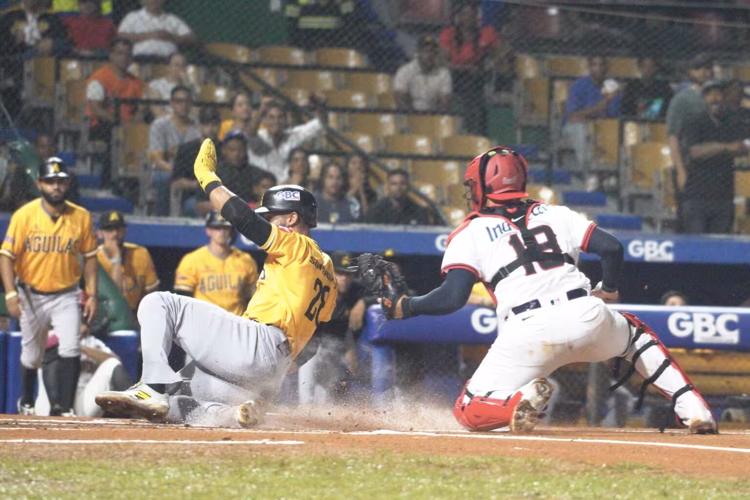 Las Águilas reaccionaron en el cuarto episodio cuando llenaron las bases frente a Travis Lakins. Un elevado de sacrificio de Juan Lagares remolcó a Aderlin Rodríguez, y un sencillo productor de Webster Rivas agregó otra para los cibaeños.