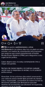 Torres calificó dichas versiones como falsas y carentes de fundamento, asegurando que no está contemplando, bajo ninguna circunstancia, su salida del PRM.