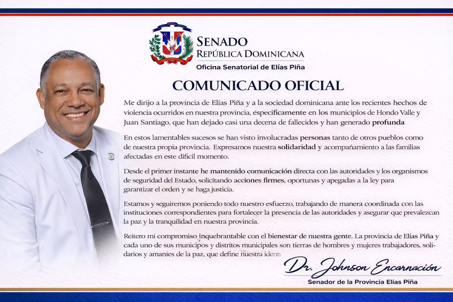 El senador por la provincia Elías Piña, Jhonson Encarnación, informó este [día de semana] que ha mantenido comunicación constante con los organismos de seguridad del Estado y las autoridades competentes, tras los recientes hechos de violencia registrados en distintas comunidades de esta demarcación fronteriza.